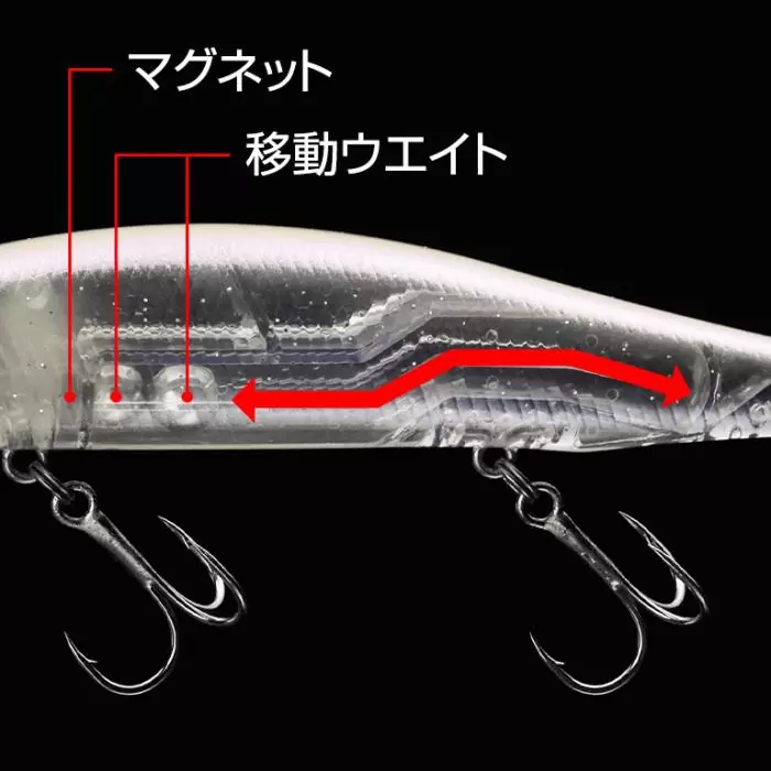 El Wake Magic nada en la superficie del agua con una acción natural de balanceo. Su cuerpo delgado está equipado con un sistema de movimiento de centro de gravedad magnético de 2 pesos que logra una distancia de lance excepcional y una estabilidad de acción equivalente a un centro de gravedad fijo. Combinado con la exquisita configuración del rango de buceo desde la superficie del agua hasta justo por debajo, continúa nadando de manera estable sin saltar fuera del agua incluso con viento y condiciones ligeramente agitadas en las que los wakebaits convencionales no son del todo acertados.
