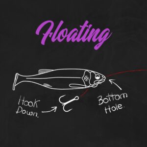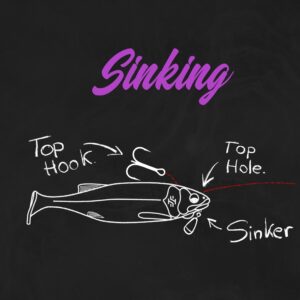 Se puede colocar el anzuelo triple tanto en la cavidad que tiene en la parte de arriba como en la de la parte de abajo, según queramos trabajarlo cerca de la superficie o mas profundo, una vez el depredador pique el triple se desprenderá de nuestro señuelo lo que significa mas durabilidad de nuestro señuelo.